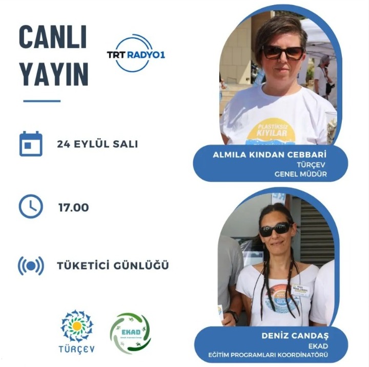'Plastiksiz Kıyılar, Plastiksiz Sular' Projesini tanıtmak ve merak edilenleri yanıtlamak amacıyla TÜRÇEV Genel Müdürü Almıla Kından Cebbari ve EKAD Eğitim Programları Koordinatörü Deniz Candaş, 24 Eylül Salı günü saat 17.00'da Ayla Sert'in yapımcılığıyla TRT Radyo 1'de yayınlanan 'Tüketici Günlüğü' programına konuk olacaklar.